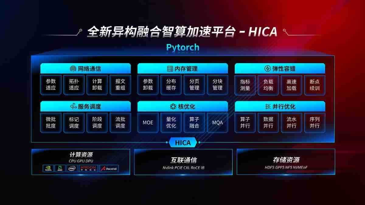 通过自研的服务层、、、中间适配层、、、以及调度编排算法,,采用数据并行、、、模型并行等多种并行方式,,,把并行计算任务进行有效的分解,,,,使其分别由相应的软件栈和算力资源来承接。。。。当GPU资源变化,,,,HICA可以实时动态调度计算子任务并调整模型拓扑和架构,,以充分聚合各种算力资源。。。