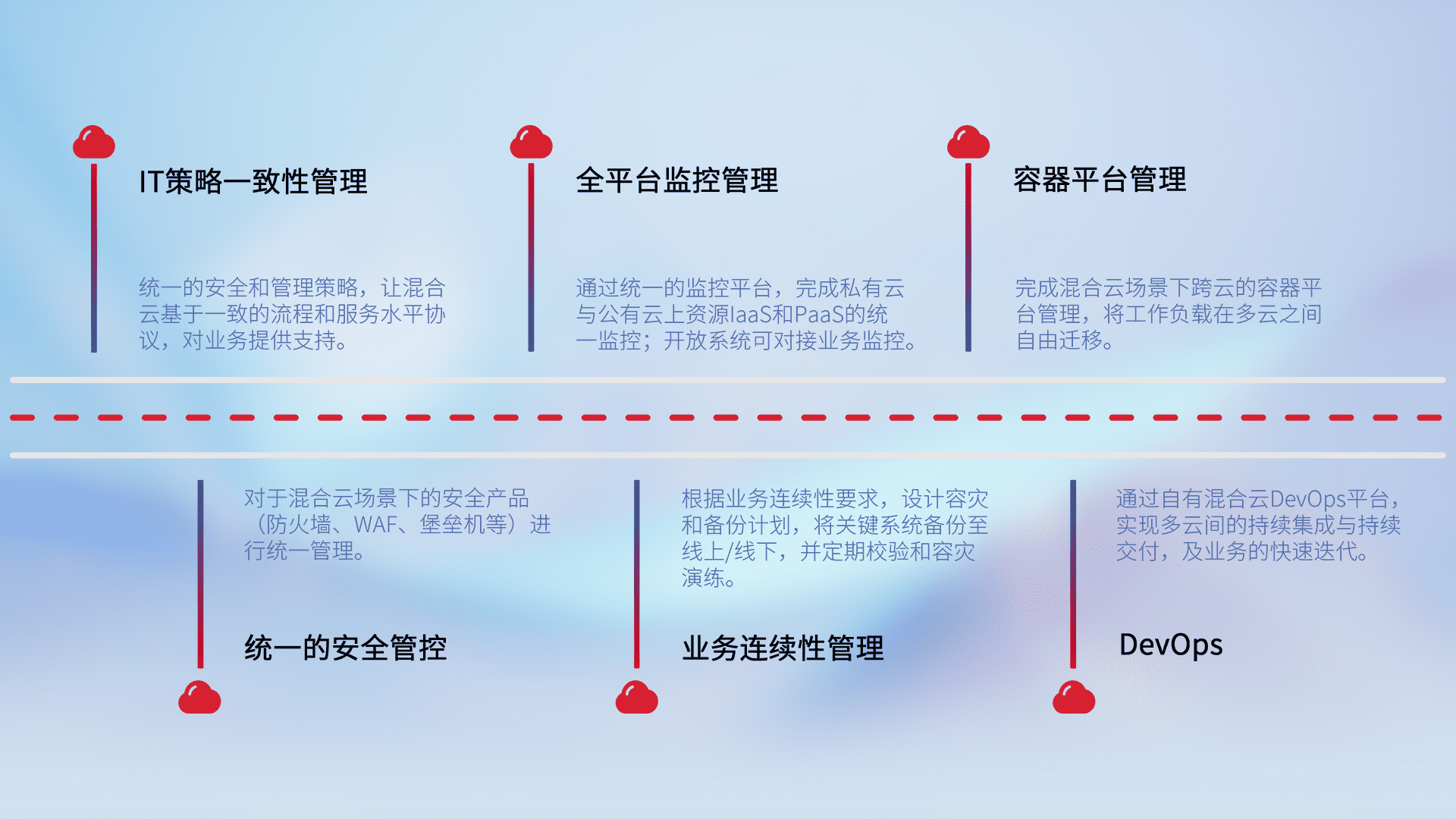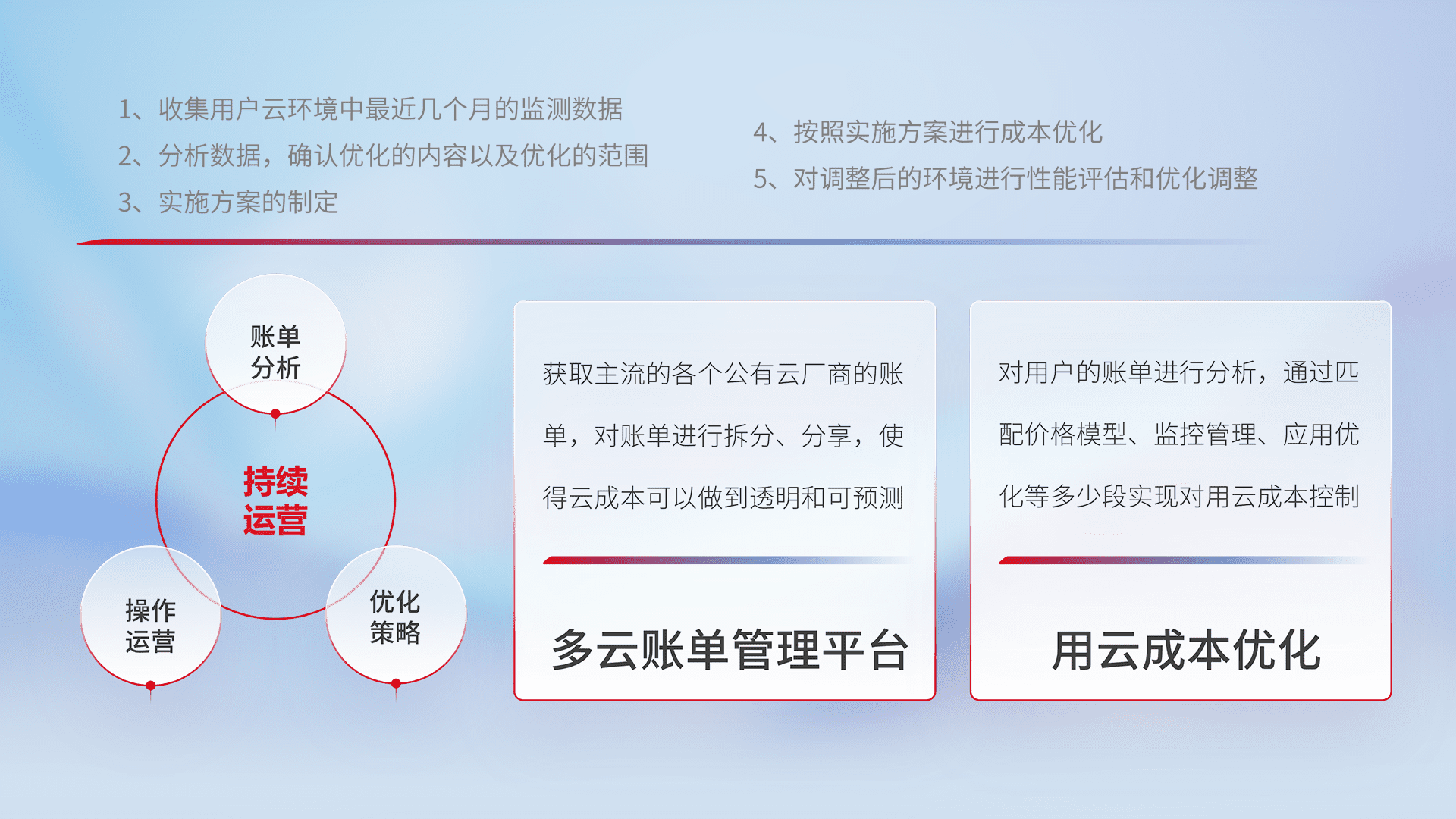 通过多云纳管,,以统一的资源数据模型把客户的云资源进行抽象和封装,,进而实现对多云资源的统一操作,,,,保障云资源管理的可靠性、、、、稳定性与可用性。。量身定制化运维内容,,,,配置、、开发运维、、、、补丁管理、、备份、、、监控、、认证和访问管理、、、、审计和日常巡检等,,,,保障在用云过程中的可靠度,,,,稳定度以及高可用率。。