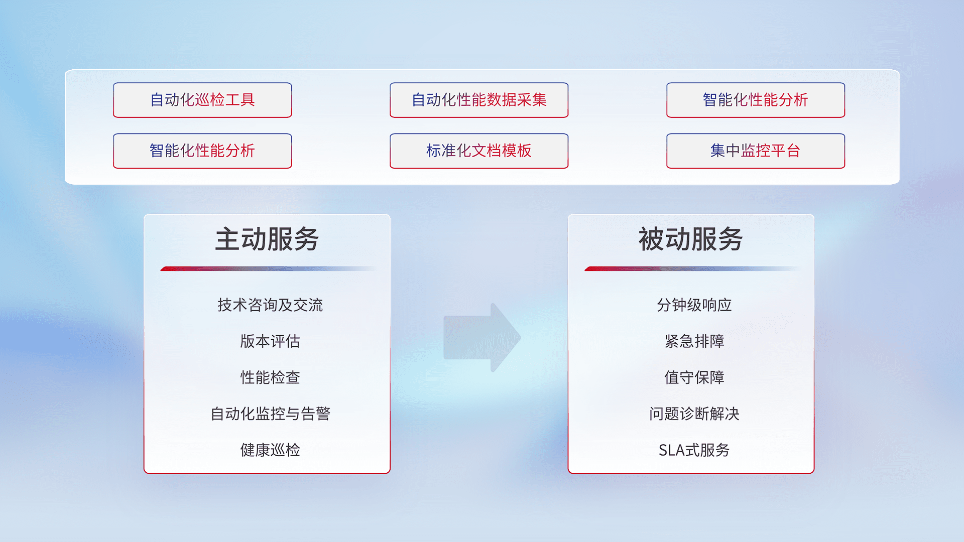 智能化工具和标准化文档,,,保障服务质量,,,,提供主动服务(包含技术咨询、、、、版本评估、、、性能检查、、、自动化监控与告警、、健康巡检)和被动服务包含(分钟级响应、、、紧急排障、、值守保障、、、问题诊断解决、、、SLA服务)。。。。