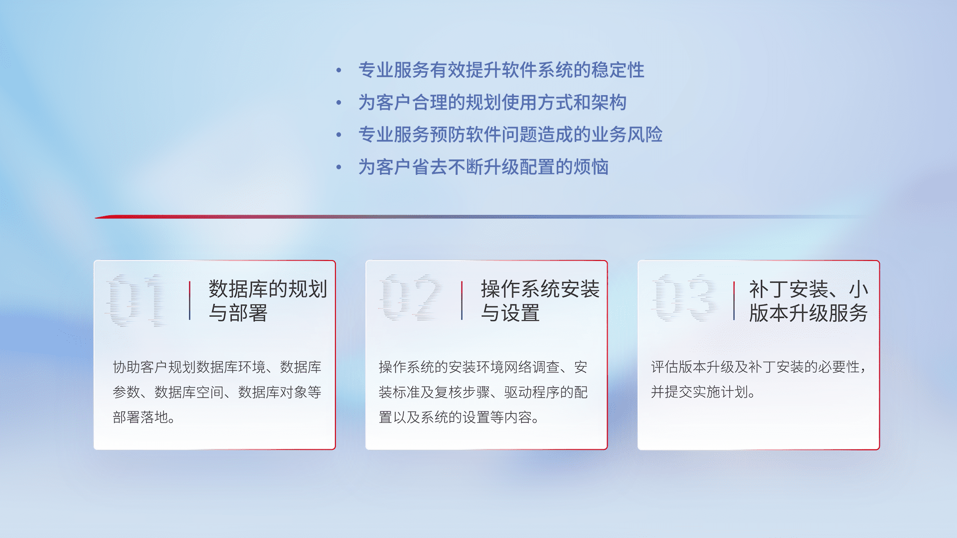 为客户提供软件规模升级、、快速部署、、按需配置的专业服务,,,从数据库的规划与部署到操作系统的安装与设置,,,再到补丁安装和小版本升级提供支持。。。。
